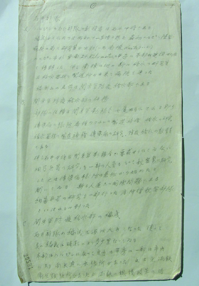 15日,侵华日军第七三一部队罪证陈列馆公布了侵华日军第七三一部队(简称731部队)第二任部队长北野政次接受美国德特里克堡基地调查官问讯后,向美军提供的17页笔供。这份笔供系首次公布,北野政次从731部队的5个方面进行了系统的供述,并承认研究使用细菌武器,进行了人体实验。