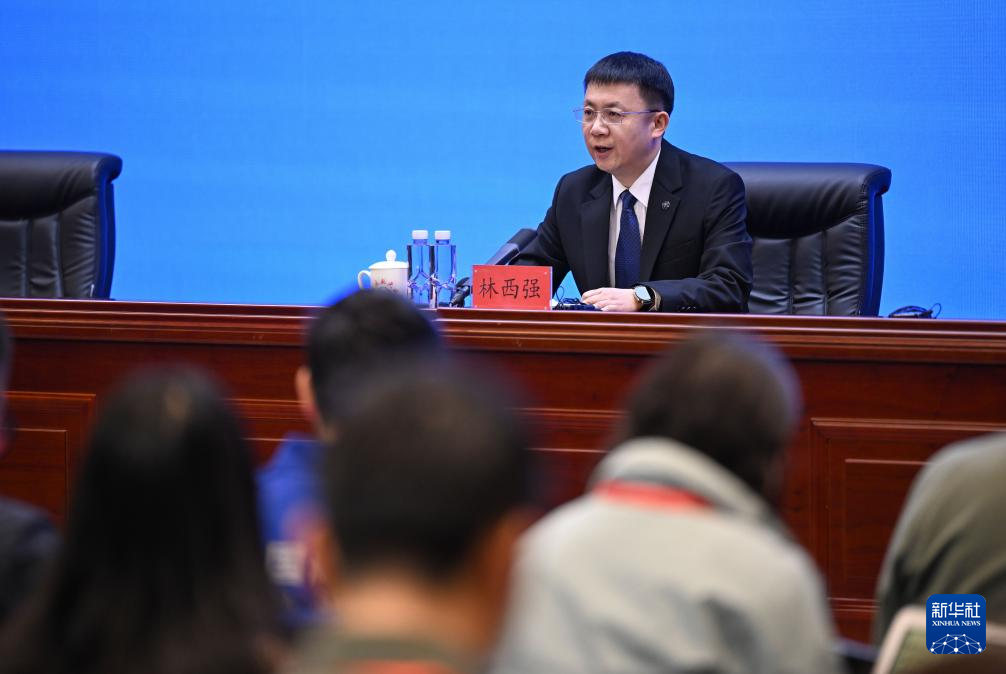 4月24日,神舟十八号载人飞行任务新闻发布会在酒泉卫星发射中心举行。这是中国载人航天工程新闻发言人、中国载人航天工程办公室副主任林西强在介绍情况。新华社记者 贝赫 摄