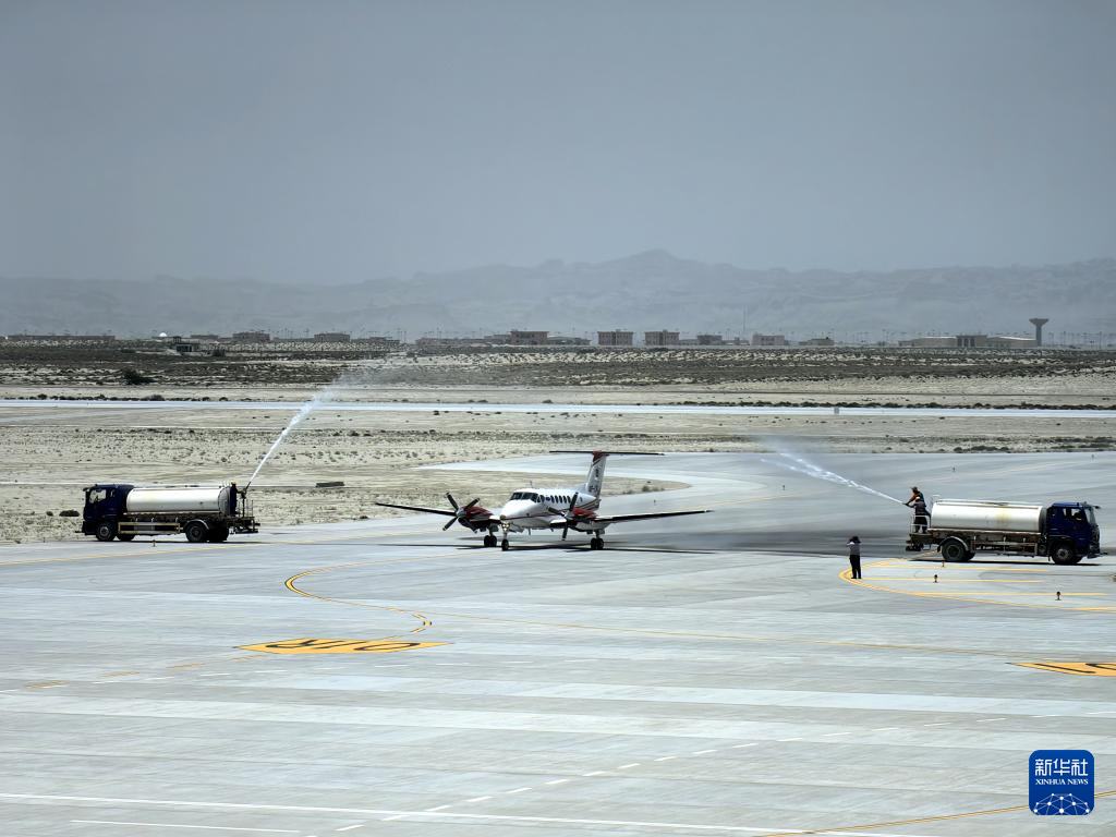 6月4日,在位于巴基斯坦瓜达尔的瓜达尔新国际机场,校飞试验成功着陆的飞机接受“水门礼”。