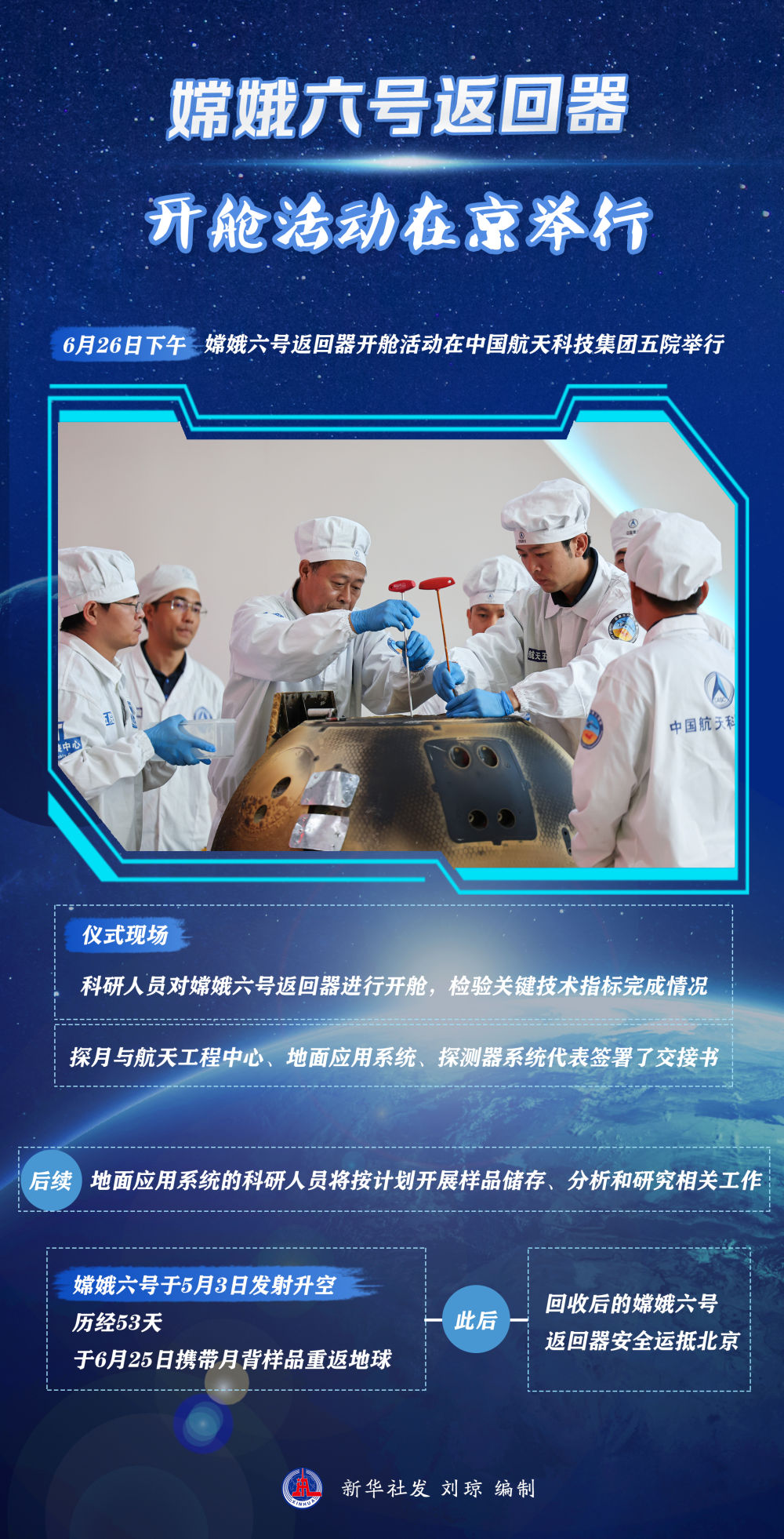 新华社北京6月26日电(记者宋晨)6月26日下午,嫦娥六号返回器开舱活动在中国航天科技集团五院举行。