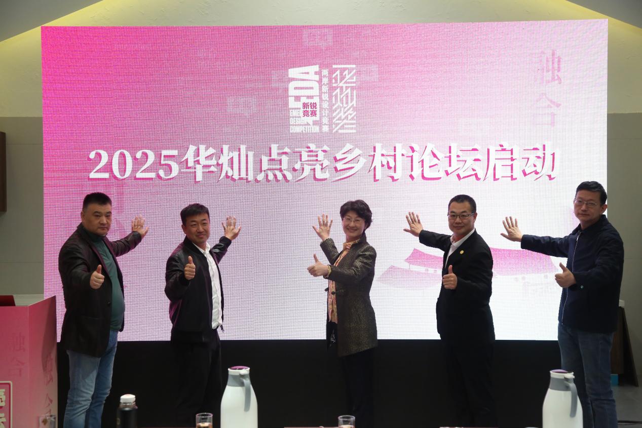 最后,由民革中央常委、联络部部长、中华中山文化交流协会秘书长张庆盈,北京市台办副主任刘先传,民革市委副主委傅川,中共北京市平谷区委常委、统战部部长刘堃,华灿工场(北京)科技发展有限公司创始人杨学兵上台,共同启动“2025华灿点亮乡村论坛”。