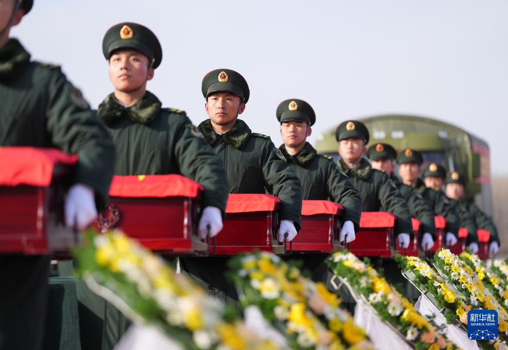 11月28日,在沈阳桃仙国际机场,礼兵将殓放志愿军烈士遗骸的棺椁从专机上护送至棺椁摆放区。