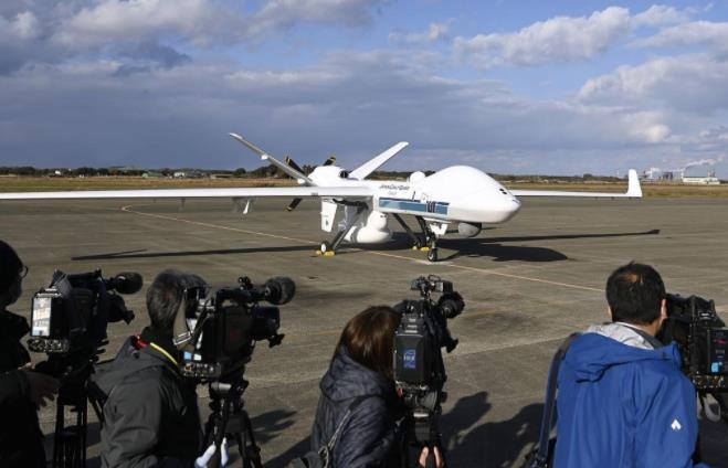 在青森县的日本海上自卫队八户空军基地,日本海上保安厅向媒体展示无人机MQ-9B“海上守护者”。(视觉中国)