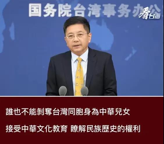 任何人都不应该,也不能剥夺台湾同胞身为中华儿女接受中华文化教育、了解民族历史的权利。民进党当局数典忘祖,妄图通过在教育和文化领域搞“去中国化”谋“独”,只会伤害台湾社会,荼毒台湾青年。奉劝民进党当局尽早悬崖勒马,否则必将沦为民族罪人,被牢牢钉在历史的耻辱柱上。