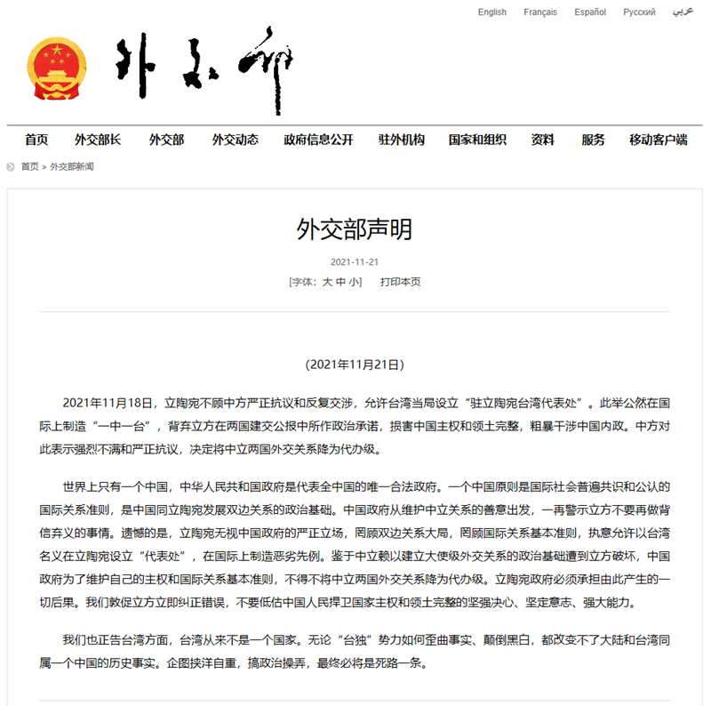 11月18日,立陶宛不顾中方严正抗议和反复交涉,允许台湾当局设立“驻立陶宛台湾代表处”。外交部声明表示,此举公然在国际上制造“一中一台”,背弃立方在两国建交公报中所作政治承诺,损害中国主权和领土完整,粗暴干涉中国内政。中方对此表示强烈不满和严正抗议,决定将中立两国外交关系降为代办级。