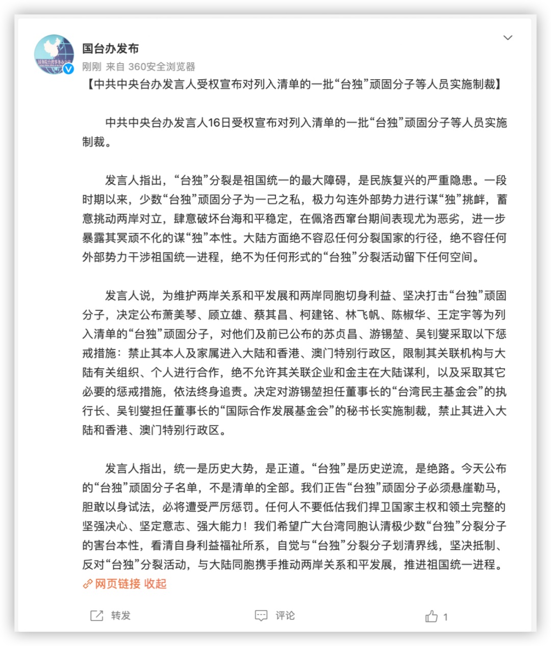 8月16日,“台独”顽固分子清单又增加了7人,加上此前3人,总共有10人被“拉清单”。该消息传到岛内,引发不少岛内网友点赞,直言“台独”绑架台湾,“早该制裁了”。