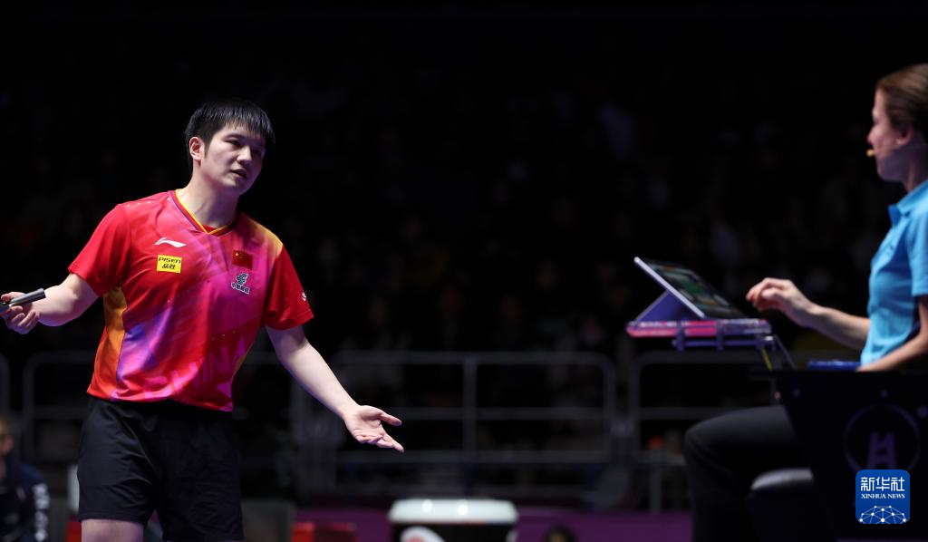 2月25日,樊振东被判罚黄牌后与裁判交流。