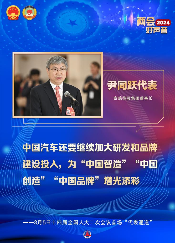奇瑞控股集团董事长尹同跃代表第一个走上通道,分享他亲历我国汽车工业从弱到强的感受。