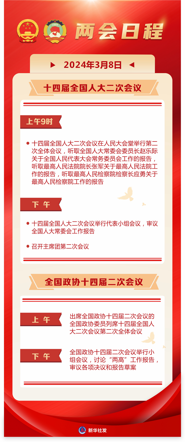 新华社北京3月7日电 8日上午9时,十四届全国人大二次会议在人民大会堂举行第二次全体会议,听取全国人大常委会委员长赵乐际关于全国人民代表大会常务委员会工作的报告,听取最高人民法院院长张军关于最高人民法院工作的报告,听取最高人民检察院检察长应勇关于最高人民检察院工作的报告。