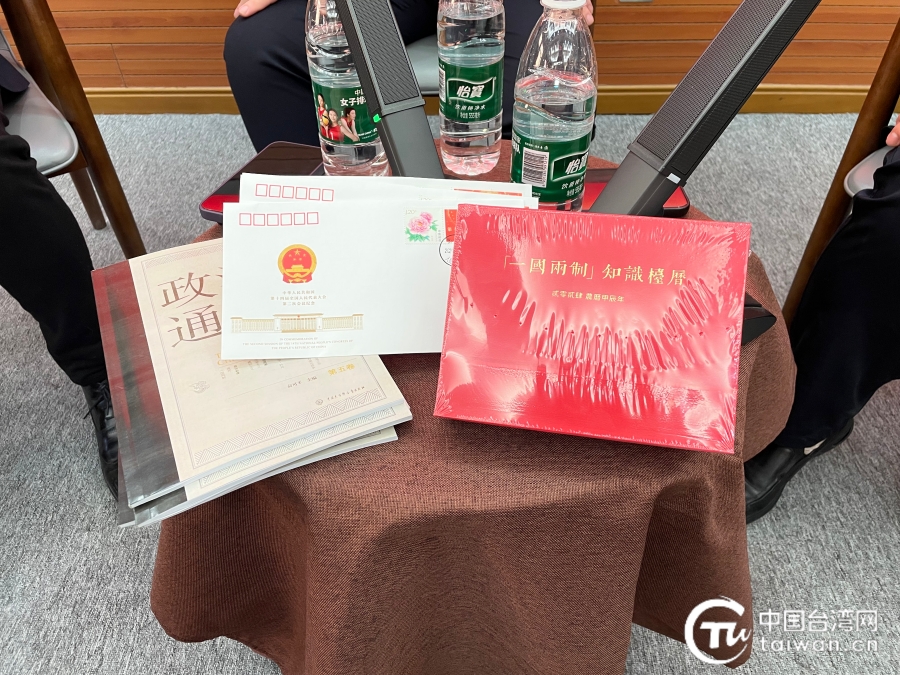 在提问环节,两位港区代表、活动主办方为参与活动的同学精心准备了2024全国两会“首日封”、2024版“一国两制”知识台历等小礼品。(中国台湾网 常凯特 摄)