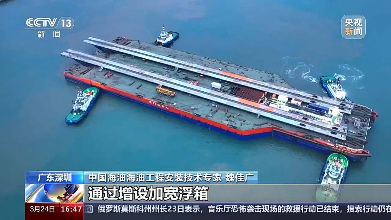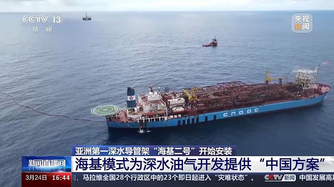 总台央视记者 古峻岭:这里是位于深圳东南方向240多公里处的流花油田海域,我们现在看到的这个大家伙,就是搭乘亚洲最大下水驳船——海洋石油229的海基二号深海导管架。它相当于海上平台稳稳矗立在海底的“大长腿”,用钢量接近于一整个“鸟巢”国家体育馆。它是从广东珠海出发,经过40多个小时的长距离拖航,刚刚抵达这一片施工海域。目前正在进行海上安装前最后的准备工作。