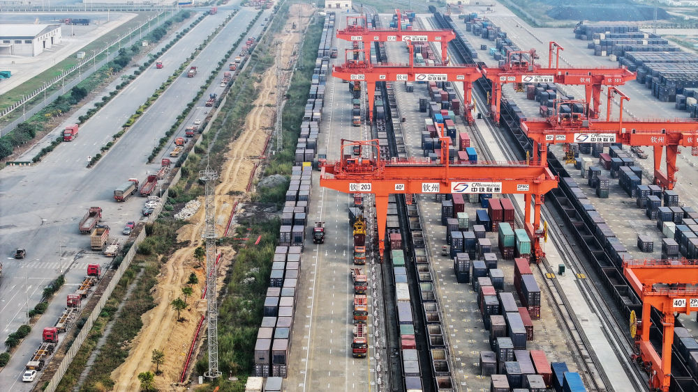 广西北部湾钦州港,装载着机械装备、电子元件和轻工产品的铁海联运班列正在繁忙运转。今年以来,西部陆海新通道铁海联运班列运输集装箱货物已突破20万标箱,创历年同期新高,日均发送2251标箱,同比增长7.2%。