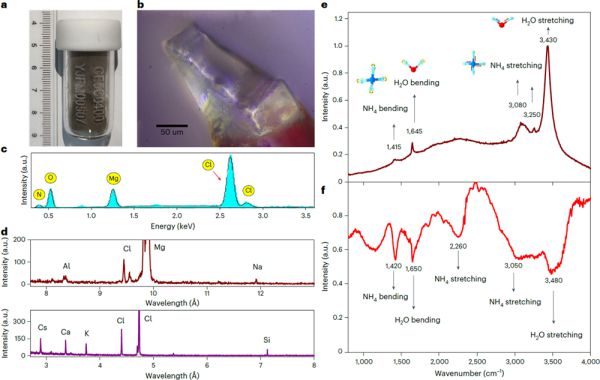 我国嫦娥5号采集的月壤样品属于最年轻的玄武岩,是迄今为止纬度最高的月球样品,为月球水的研究提供了新机遇。我国科研人员开展的这项研究基于单晶衍射和化学分析发现,这些月球水和铵以一种成分为(NH4,K,Cs,Rb)MgCl3·6H2O的水合矿物形式出现。该矿物分子式中含有多达六个结晶水,水分子在样品中的质量比高达41%。红外光谱和拉曼光谱上均可以清晰地观察到源于水分子和铵的特征振动峰。晶体的电荷密度可以清晰地看到水分子中的氢。ULM-1的晶体结构和组成与地球上近年来发现的一种稀有火山口矿物相似。地球上,该矿物是由热玄武岩与富含水和氨的火山气体相互作用形成。这为月球上的水和氨的来源提供了新线索。