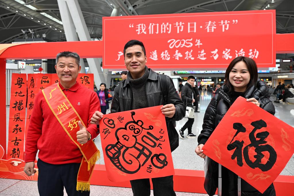 1月14日,旅客在广州南站候车大厅展示领到的春节饰品。新华社记者 邓华 摄