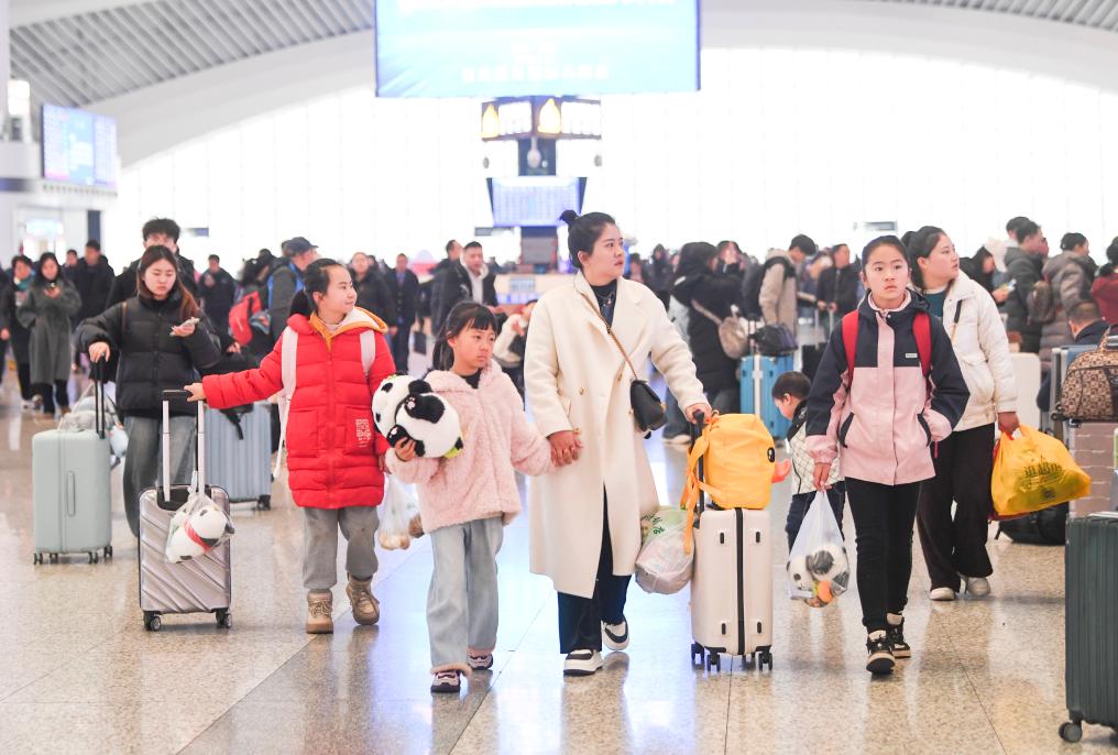 在上海虹桥站,市民王钦然一家搭乘G1627次列车回老家湖州探亲度假。连接长三角的沪苏湖高铁2024年底开通,从上海回湖州仅需约一小时。“不但车程用时比以前少了一半,可选车次也明显增加。今年春运很舒心。”王钦然说。