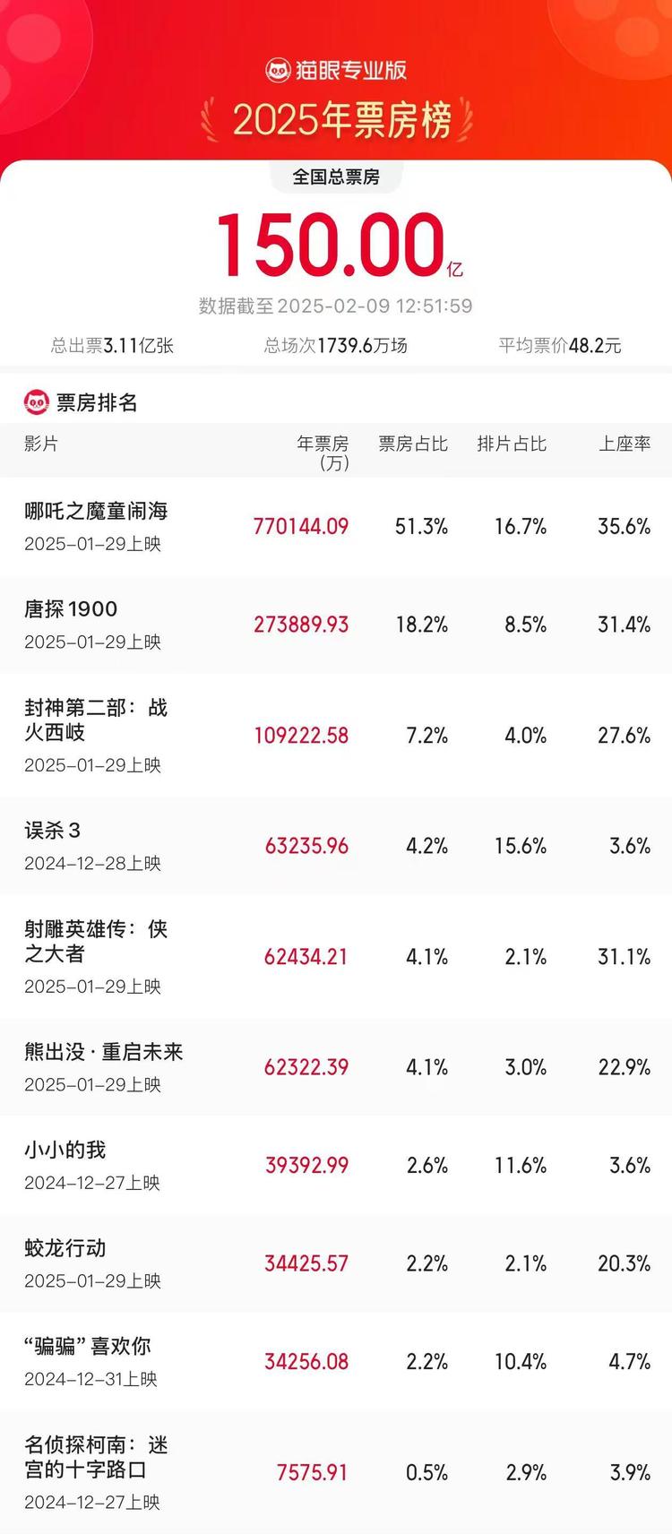 《哪吒之魔童闹海》以超51.3%的票房占比
