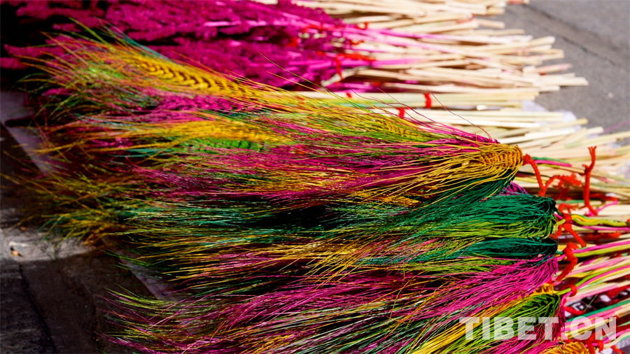 在藏历新年年货物品中,提及酥油花就不得不提它的“搭档”“罗萨梅朵”,正是因为它们的装点让藏历新年中本身就已很精致的“切玛盒”更加亮眼。“罗萨梅朵”被称为“冬季里最美丽的花”,是经过染色的麦穗和青稞穗制作成的“花卉”。在藏历新年或节日之时,人们将其插在盛满糌粑和青稞的“切玛盒”上,寓意新的一年美满、丰收。