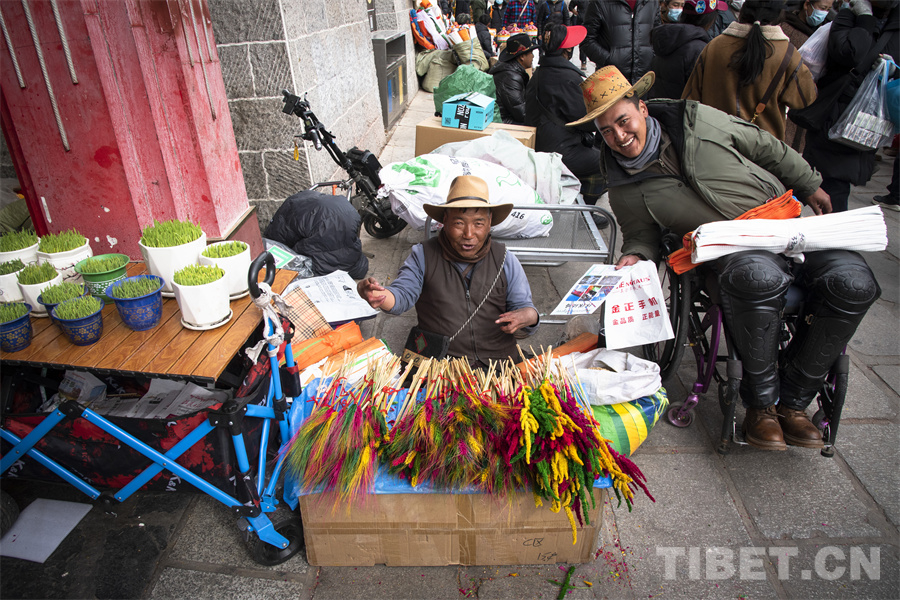 普琼,来自日喀则市江孜县,在八廓商城南门前经营着自己的“罗萨梅朵”小摊。初见普琼,我们被他冲着镜头的灿烂笑容所吸引。细细观察,普琼坐在地上的身高却比别人矮了一大截。“我们从拉萨堆龙德庆的批发市场上买来这批‘罗萨梅朵’在此销售,就希望能够在年前的这段时间多赚些小钱补贴家用,所有人都想在新年之时过个充裕的‘好年’,不是吗?”普琼因一次意外高位截瘫,失去双腿的他并没有消沉。他选择积极面对生活,用自己的双手和命运抗争,用坚强和勤劳让自己和全家过上更好的生活。与普琼不幸的经历相比,我们每个人过的每个年何尝不都是一个个“好年”呢?普琼对生活的那种热爱,对明天会更好的坚定,何尝不是我们对每一个“好年”所孜孜追求的呢?