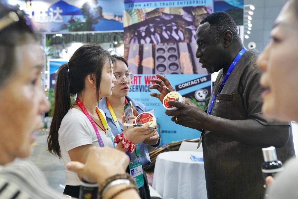 不远处的布隆迪展区,当地原料制造的辣木籽油、辣木籽身体香膏也吸引着不少专业观众前来问询、试用。短短半天,已有20多个采购商留下对接方式。