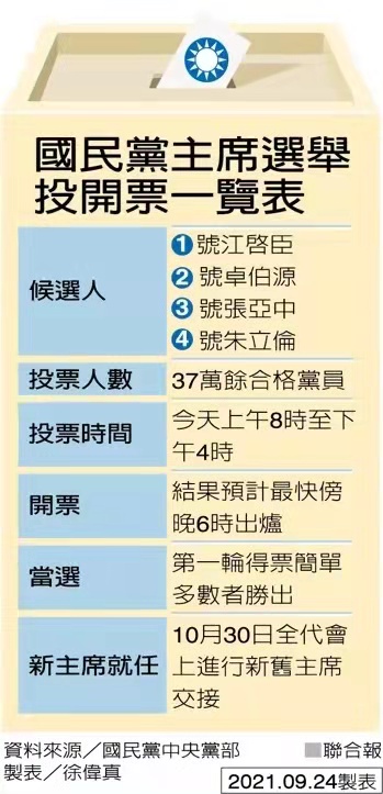 国民党主席选举今(25日)举行投票,投票时间至16时止,随即将进行开票。这次国民党主席选举原本7月24日投票,因受疫情影响延至9月25日举行。此次候选人分别是寻求连任的现任党主席江启臣、前彰化县长卓伯源、孙文学校总校长张亚中、前国民党主席朱立伦。