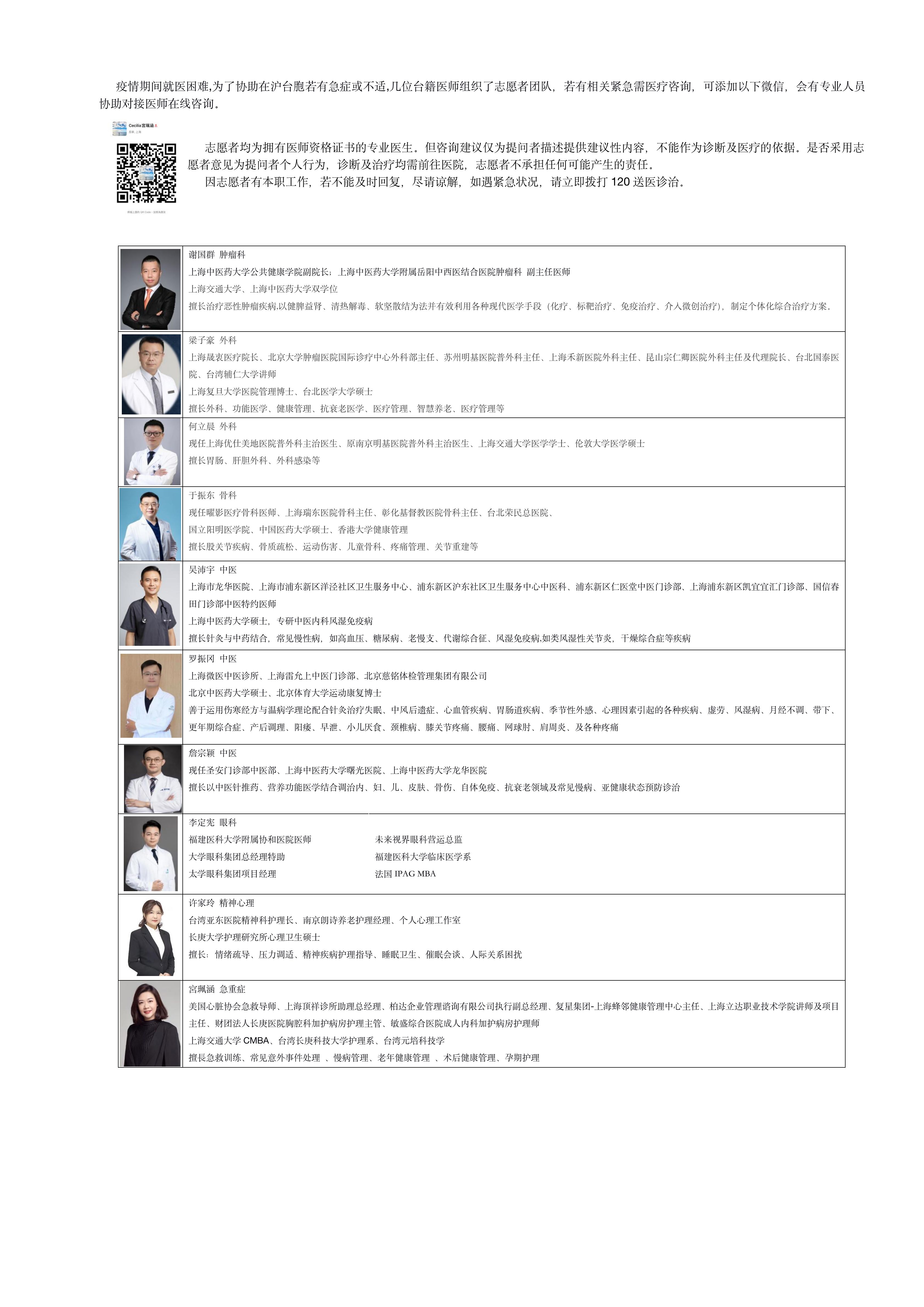 短短两天,便有10位在沪台籍医生加入医疗咨询志愿服务团队,涵盖了内科、普外科、中医科、骨科、眼科、心理咨询等科别。台胞们可以通过二维码联络志愿服务团队,在线咨询医疗问题。