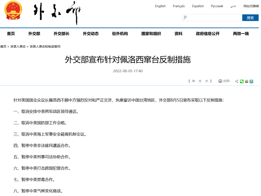 对于五个“暂停”,多名专家均认为,禁毒合作、气候合作等都是美国政府期待并需要中国协助配合的领域。在佩洛西窜台事件后,暂停在这些领域的合作是中国对美国政府作出的一种“惩戒性措施”。“此次中方的反制措施很有针对性,在实践中将产生明显效果。”一名美国事务专家这样评论。