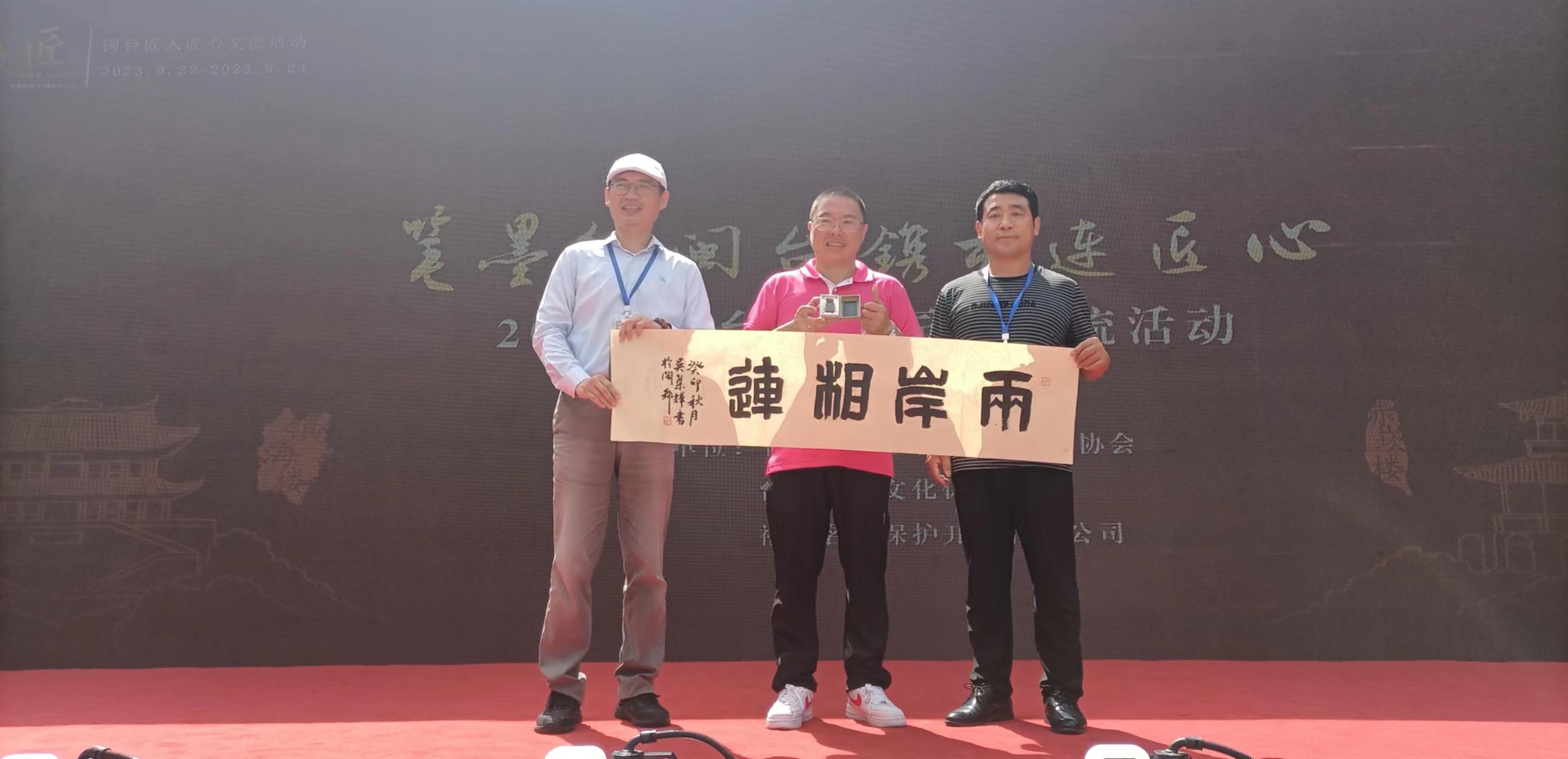 湖南省台办主任曾智夫(右)为台湾中华神农大帝协进会李火炎授予“海峡两岸炎帝神农文化交流大会台湾总召”牌匾。(中国台湾网 发)