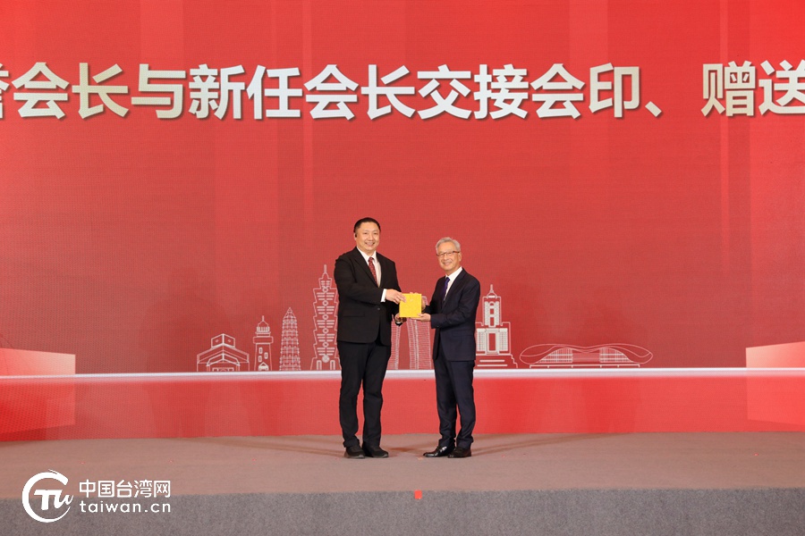 会上,苏州台协荣誉会长谢清福(右)与新任会长邱士楷(左)交接会印。(中国台湾网 尹赛楠 摄)