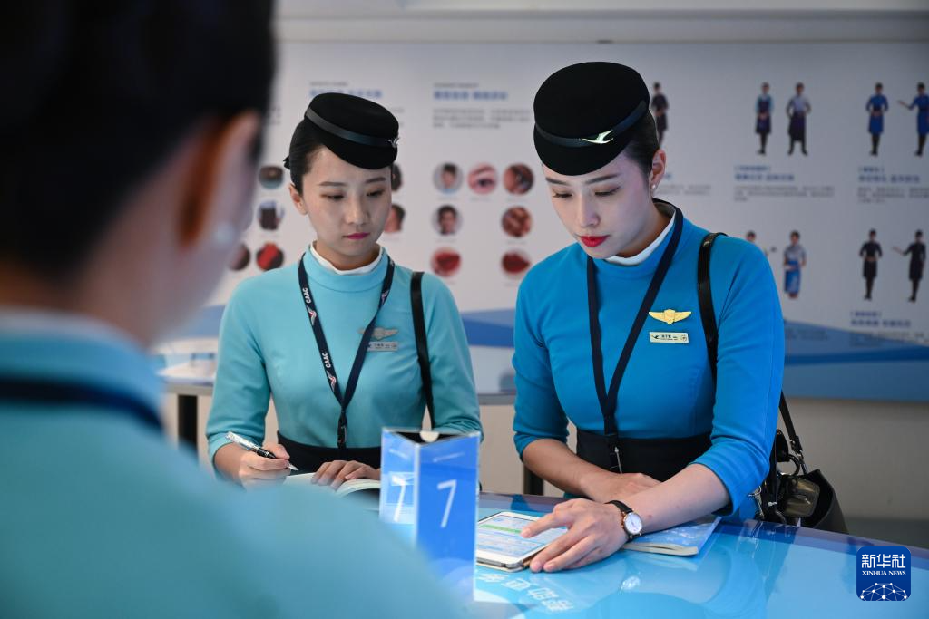 7月18日,陈于萱(右一)和同事在厦门航空乘务运行中心做航前准备工作。新华社记者 周义 摄
