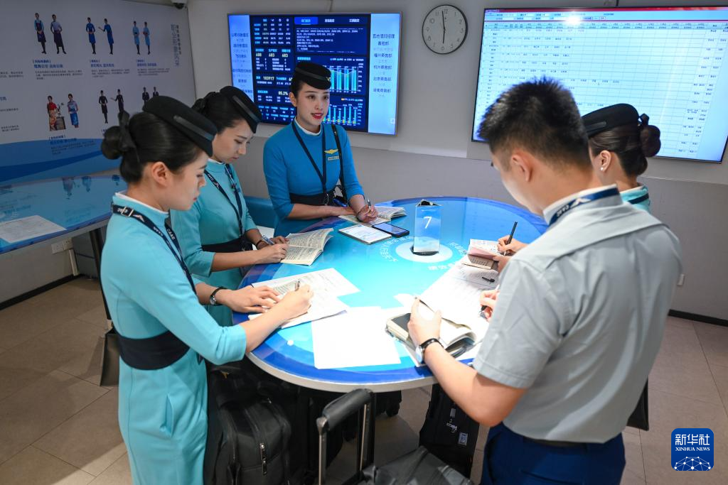 7月18日,陈于萱(左三)和同事在厦门航空乘务运行中心做航前准备工作。新华社记者 周义 摄