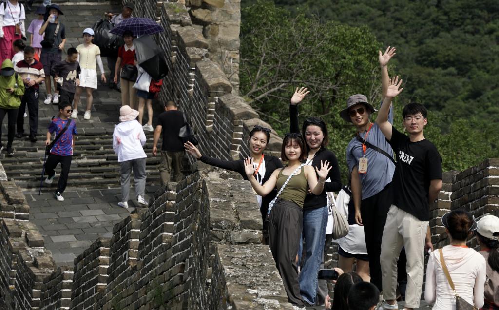 8月25日,参加第三十届海峡两岸大学生新闻营的师生们在北京慕田峪长城参观。新华社记者 李欣 摄