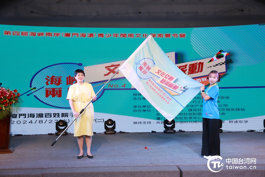 海沧区东孚街道关工委主任伊黎为来自台湾的营员代表授旗。(中国台湾网 发)