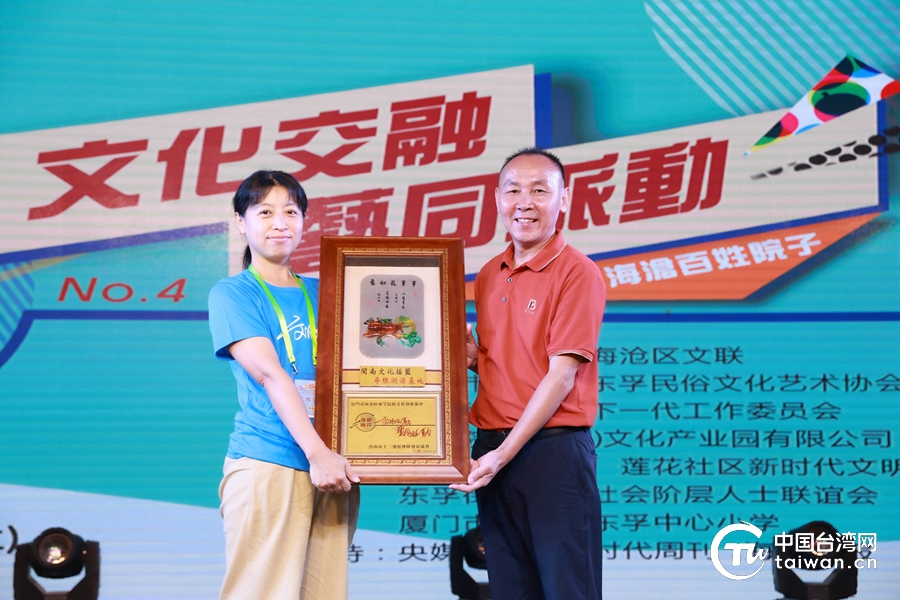 台湾带队老师为海沧区文联副主席、东孚民俗文化艺术协会会长陈原来赠送纪念品。(中国台湾网 发)
