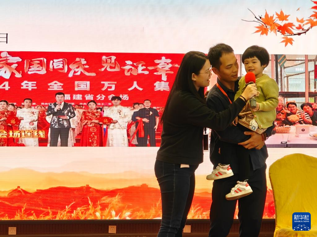 10月12日,闽台婚姻代表杨涛和洪阡嫚(左)夫妇带着女儿上台分享他们的爱情故事(手机照片)。新华社记者 许雪毅 摄
