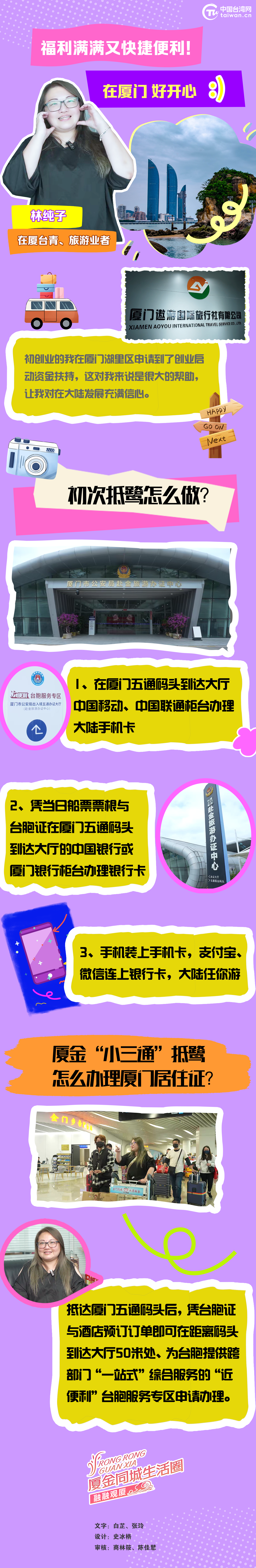 编者按:去年9月发布的《中共中央 国务院关于支持福建探索海峡两岸融合发展新路 建设两岸融合发展示范区的意见》提出,支持厦门与金门加快融合发展,打造厦金“同城生活圈”。事实上,厦门与金门的全面融合发展推进,“厦金同城生活圈”也随之加速形成。厦门与金门两地交通融合、教育融合、社会融合、经济融合、文化融合,为金门民众尤其是台湾青年提供了更多机遇。中国台湾网推出融融观厦——“厦金同城生活圈”系列主题产品,以在厦门创业、生活的金门同胞的视角,去观察、记录他们对“厦金同城生活圈”的感悟与期待,展现厦门以最前沿的姿态先行先试,以通促融、以会促融、以情促融,吸纳台胞尤其是台湾青年到厦门生活、学习、就业、创业。