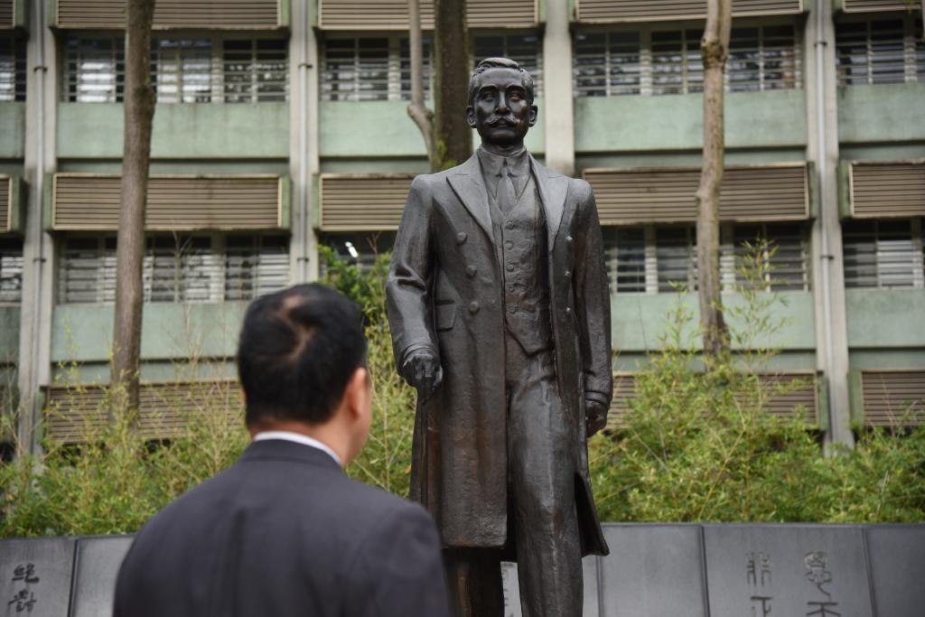 孙中山先生曾外孙王祖耀身着中山装,向先生铜像三鞠躬。“中华民族伟大复兴的正确道路,是对孙中山思想的实现和超越。”王祖耀受访时说。