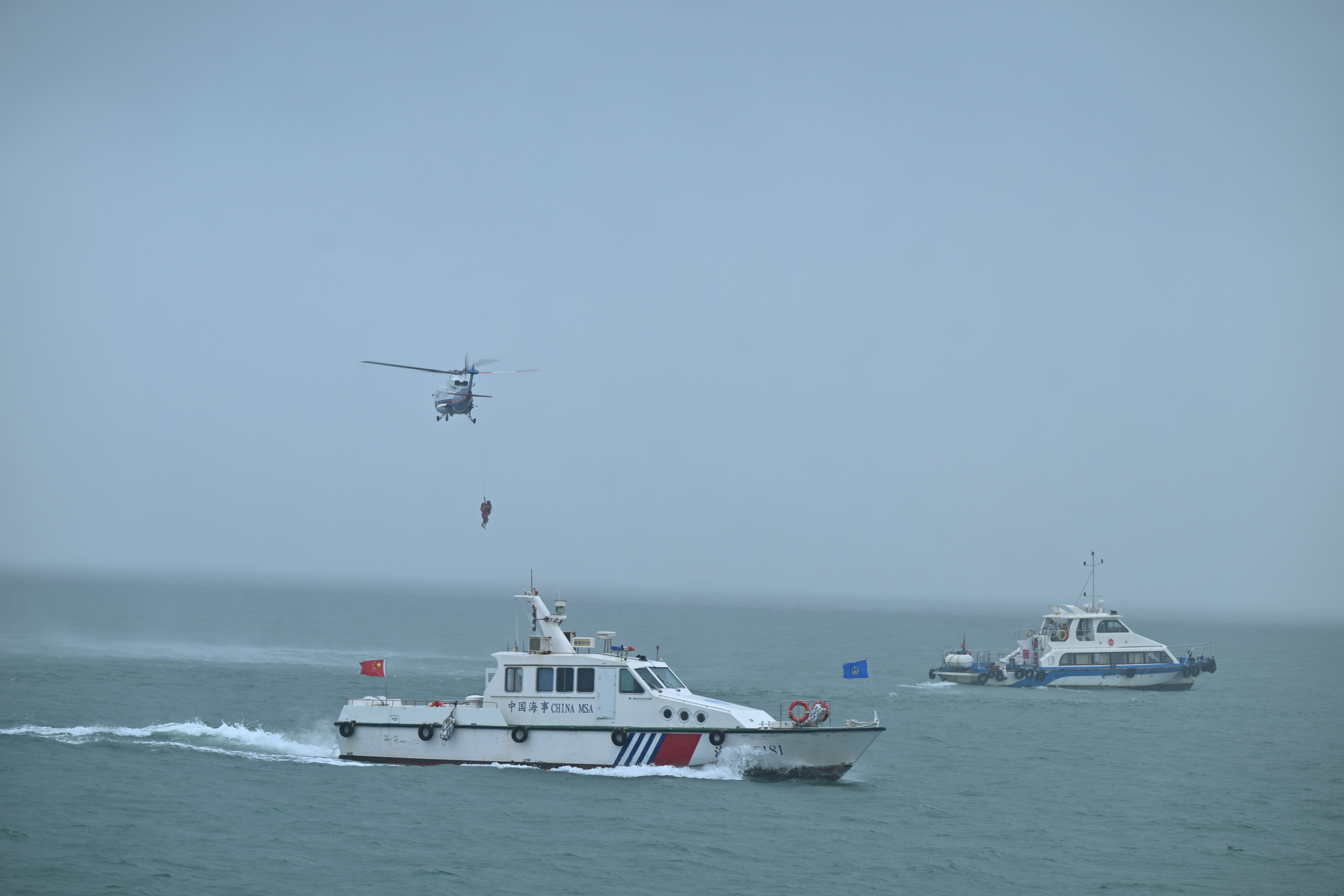 上午,嘉宾们冒着风雨来到建设中的厦金大桥(厦门段)施工平台,观摩海上搜救应急演练,通过落水人员搜救、伤员转移、船舶消防灭火、溢油围控清除等科目,沉浸式体验海上救援的迅速、精准和安全。