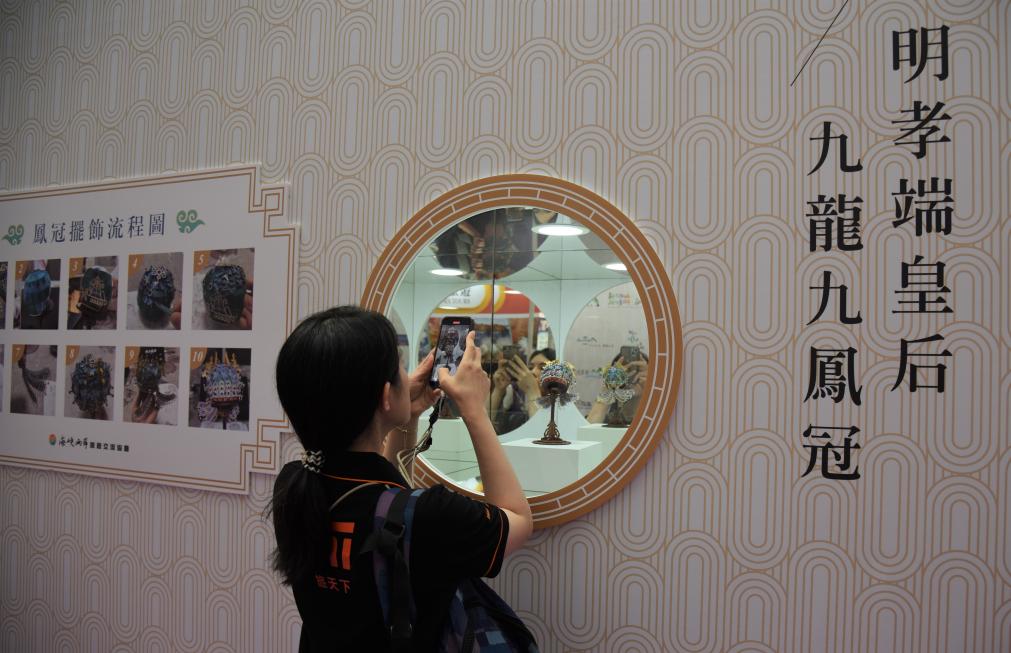 其中,以“明孝端皇后九龙九凤冠”为设计原型的文创产品颇受观众欢迎。记者在现场看到,展出的凤冠冰箱贴不仅保留了文物的精美细节,还增加了“科技含量”,游客可通过扫描产品外包装的AR体验码生成头戴凤冠的照片,吸引大批民众驻足赏玩、拍照留念。