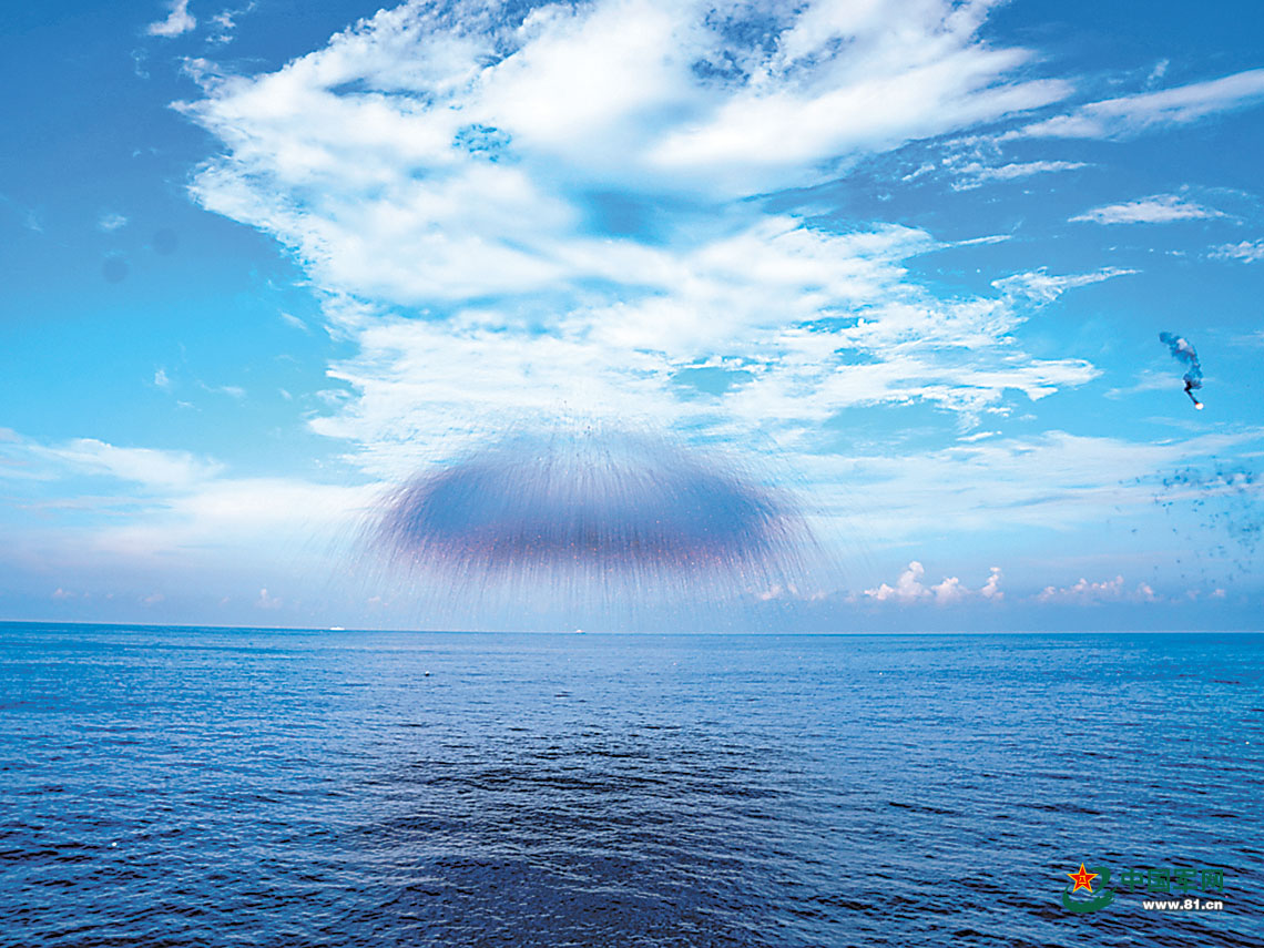 参训舰艇发射火箭深弹。