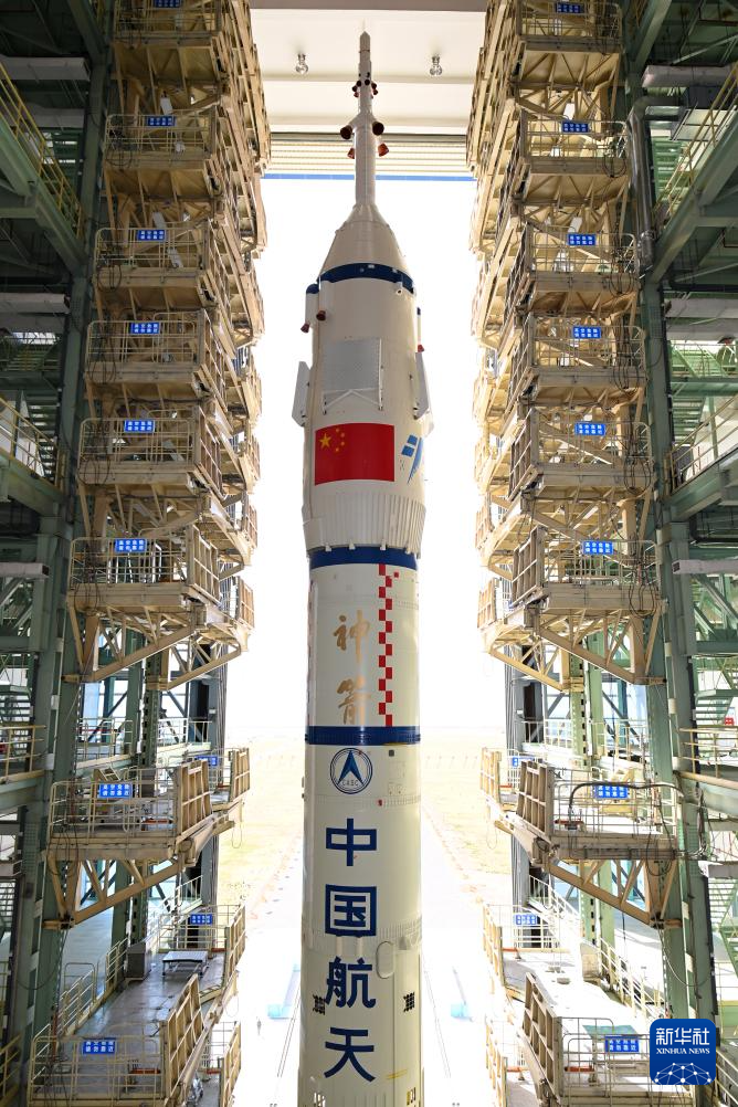 4月17日,神舟十八号载人飞船与长征二号F遥十八运载火箭组合体在垂直转运中。