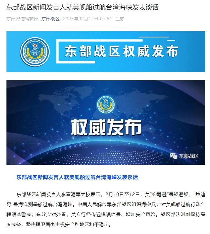 东部战区新闻发言人李熹海军大校表示,2月10日至12日,美“约翰逊”号驱逐舰、“鲍迪奇”号海洋测量船过航台湾海峡。中国人民解放军东部战区组织海空兵力对美舰船过航行动全程跟监警戒,有效应对处置。美方行径传递错误信号、增加安全风险。战区部队时刻保持高度戒备,坚决捍卫国家主权安全和地区和平稳定。