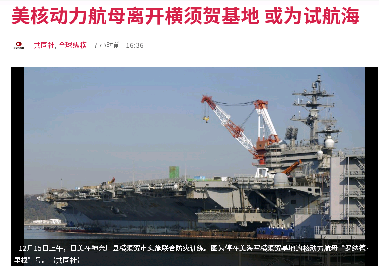日本共同社8日称,部署在驻日美海军横须贺基地的美国核动力航母“里根”号离开该基地进行出海训练。这证明了台湾方面此前宣称亚太地区已有两艘美国航母与中国航母辽宁舰“同框”,实在是说得太早了。