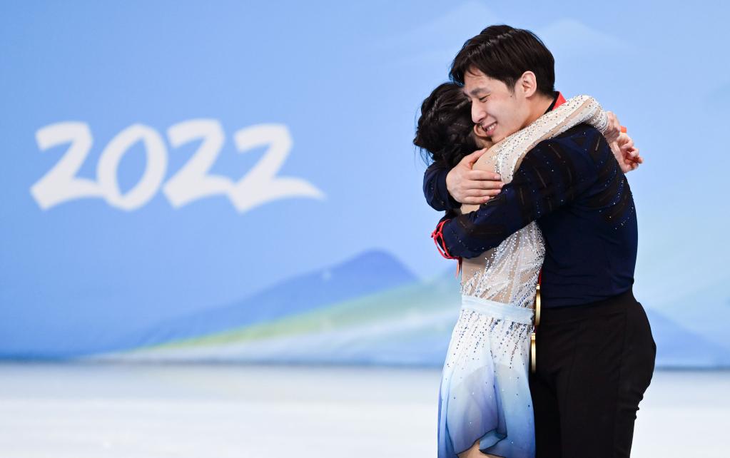 2月19日,隋文静/韩聪(右)在奖牌颁发仪式上。新华社记者李尕摄