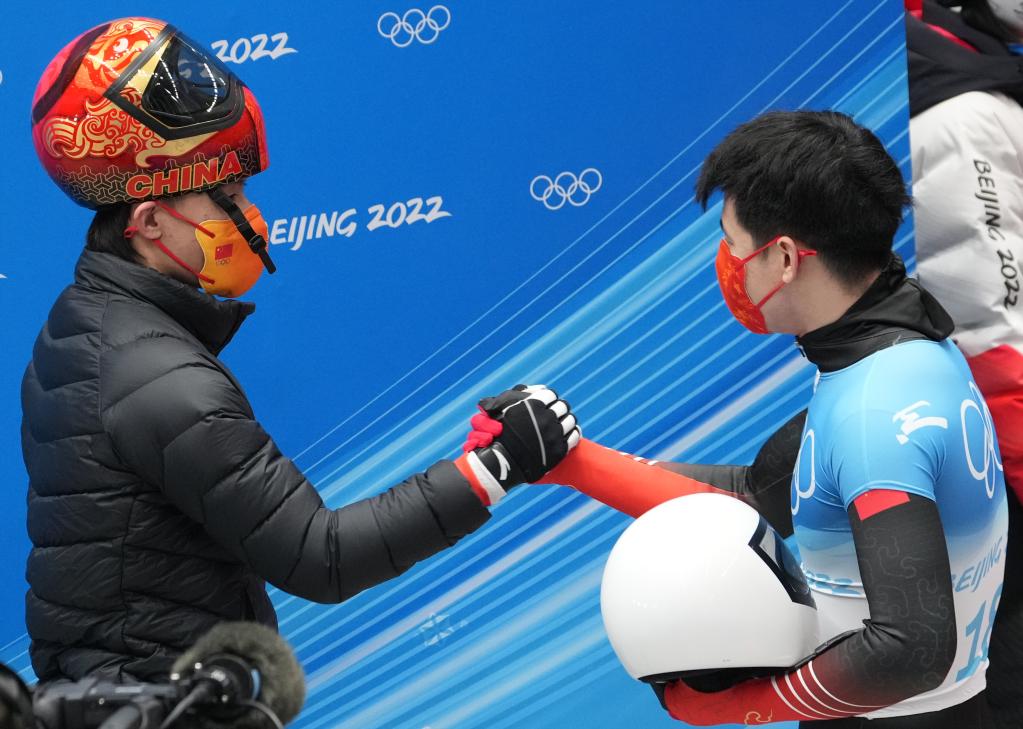 2月11日,闫文港(右)在国家雪车雪橇中心举行的北京2022年冬奥会男子钢架雪车比赛后和队友殷正握手。新华社记者孙非摄