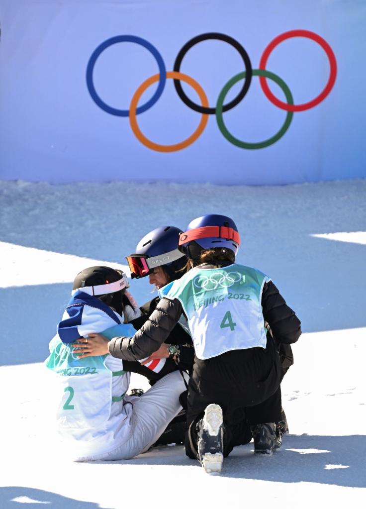 2月8日,谷爱凌(右)和瑞士选手玛蒂尔德·格雷莫德(中)在比赛后安慰法国选手苔丝·勒德。新华社记者武巍摄