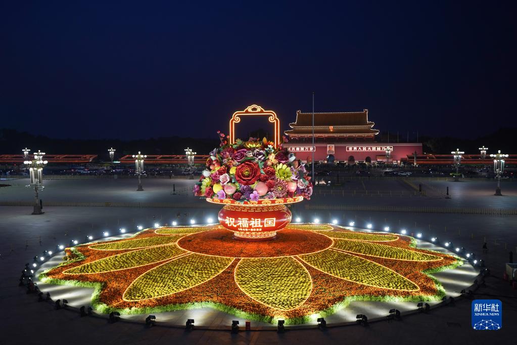 9月25日拍摄的夜间亮灯后的“祝福祖国”巨型花果篮。
