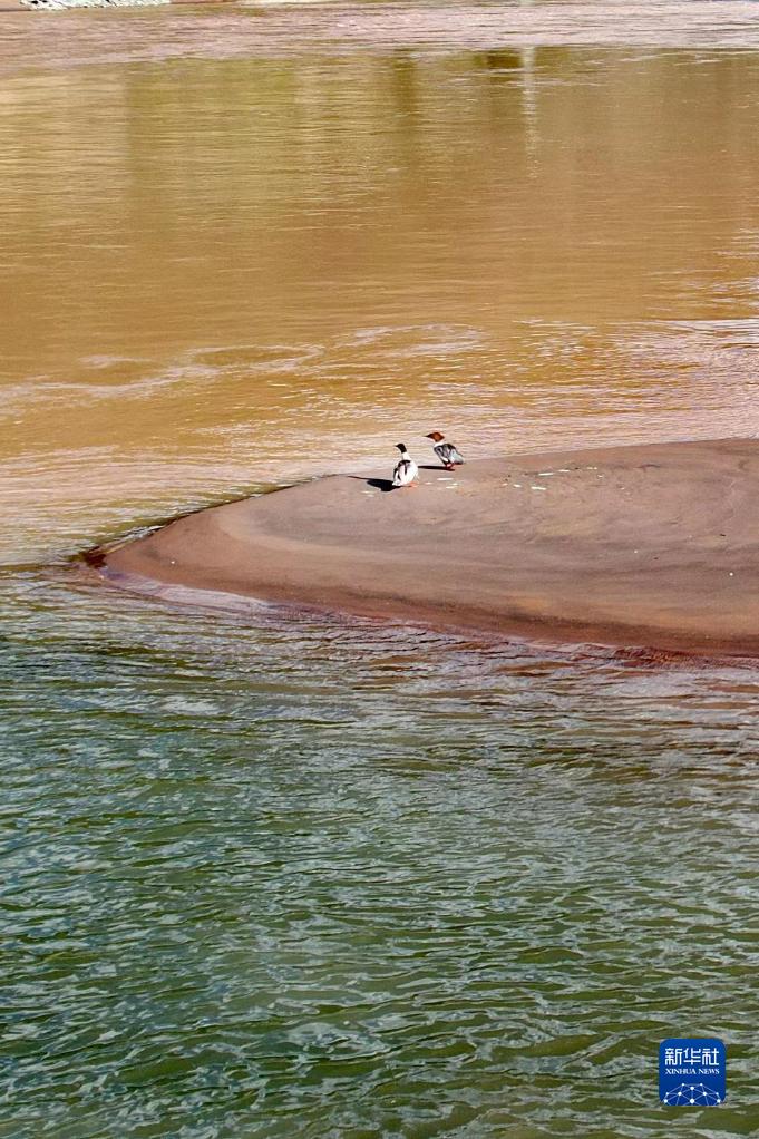 通天河与巴塘河交汇处的两只水鸟(7月22日摄,无人机照片)。 新华社记者 刘诗平 摄