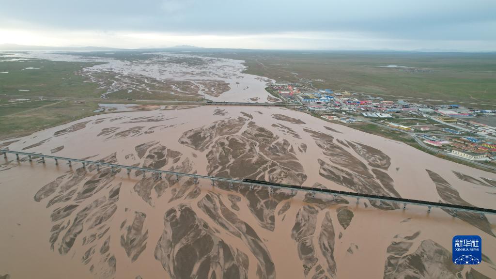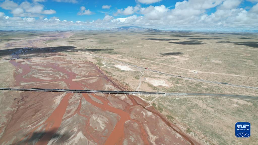 青藏铁路列车通过楚玛尔河(7月29日摄,无人机照片)。 新华社记者 刘诗平 摄