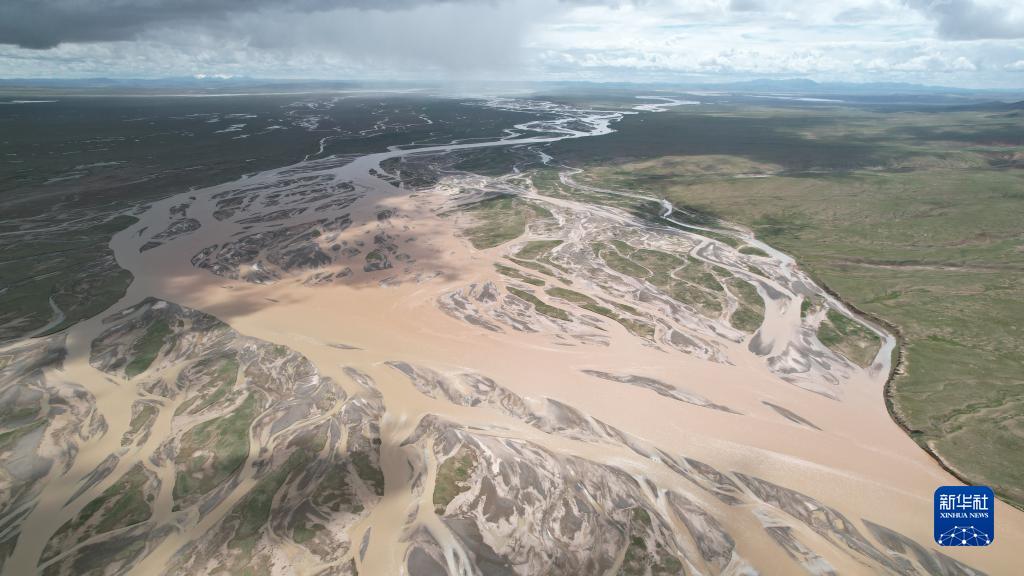 沱沱河与当曲汇合处的囊极巴陇,辫状河道宽度超过3千米(7月26日摄,无人机照片)。 新华社记者 刘诗平 摄