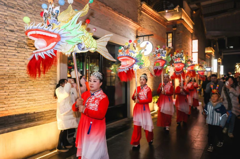 元宵当晚,已有两千余年历史、曾登上亚运会开幕式大银幕的浙江省非遗“鸬鸟鳌鱼灯”带来精彩纷呈的弄堂巡游,16位传承舞者挥动起一条条长1.5米、灯头如龙、灯身如鱼的大型灯盏,鼓乐齐鸣声中,游走于交错的8条弄堂间,展现出“游鱼如龙”的震撼景象。25日下午,上海轻音乐团带来元宵音乐会,以都市轻音乐的文化魅力,增添城市佳节如意吉祥的热闹氛围。